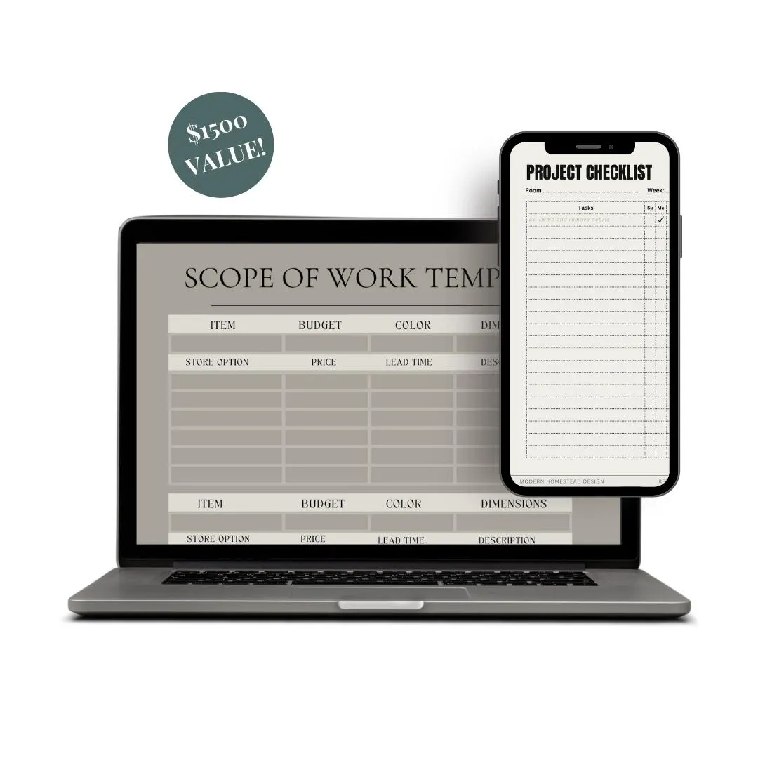 Scope of Work, design sheets, project calendar, room-by-room templates & more helpful templates and documents for your planning needs.